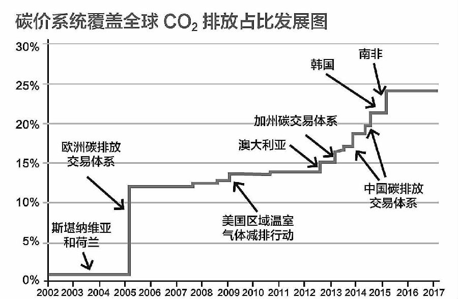 据了解,目前大约有40个国家(包括28个欧盟成员国),以及23个城市、地区采用了碳价政策。这些地区的碳排放占全球总排放的12%。