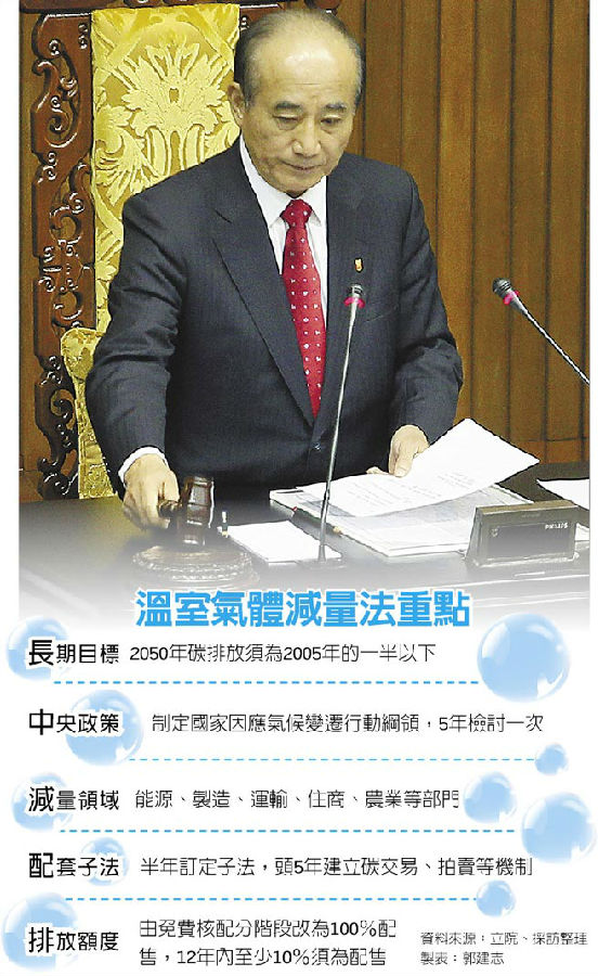 政院版温减法草案在民国2006年送入立院后审查不顺,又基于届期不连续原则,环保署在2012年第3度送进立院审议,联合国气候变化框架公约会议今年12月将于巴黎召开,届时若台湾仍无温减法源恐遭国际制裁,因此卫环委员会在5月下旬连日赶工完成初审,上周经马拉松式协商后终于定案,昨顺利三读过关。台湾在2005年的二氧化碳排放量为245百万吨,亦即在2050年时,二氧化碳的排放须控制在122.45百万吨之内。