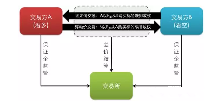 (3)差价结算:合约结算日,交易所根据P固和P浮之间的差价对交易结果进行结算。若P固<P浮,则A为盈利方,B为亏损方,B向A支付资金=(P浮-P固)×标的碳排放权;若P固>P浮,则A为亏损方,B为盈利方,A向B支付资金=(P固-P浮)×标的碳排放权。