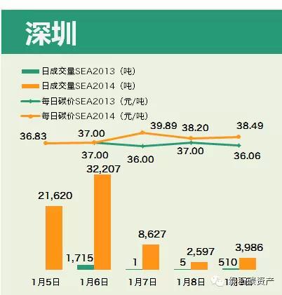 本周三(1月7日)产生了2015年的第一笔交易,当日总成交量496吨,成交价32.57元/吨。但在其后两日,成交量降至5吨/天,碳价也一路下滑,周五跌至26.44元/吨,一周跌幅18.82%。