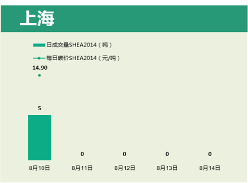 上海碳市经历了上周中的短暂活跃以后,本周SHEA2014交易颇为冷清,仅周一有5吨的交易量。配额价格略有回升,达到14.9元/吨。