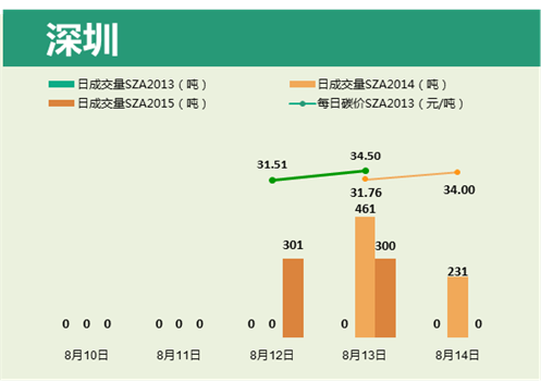 本周深圳配额总共成交1,293吨,成交额为42,329.50元,皆比上周的数据降低了八成七左右。其中SZA2013无成交量,SZA2014共成交692吨,SZA2015共成交601吨。本周深圳配额平均价格在32.7元/吨左右。