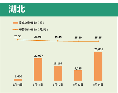 本周湖北的配额交易略为回暖,总共成交70,132吨HBEA,较上周增加了约24%,。总成交额为1,789,272.07元,环比增长40%。价格介于25.2元~26.5元之间,从价格走势看有轻微下降,不过交易量相对提升了。