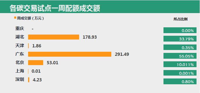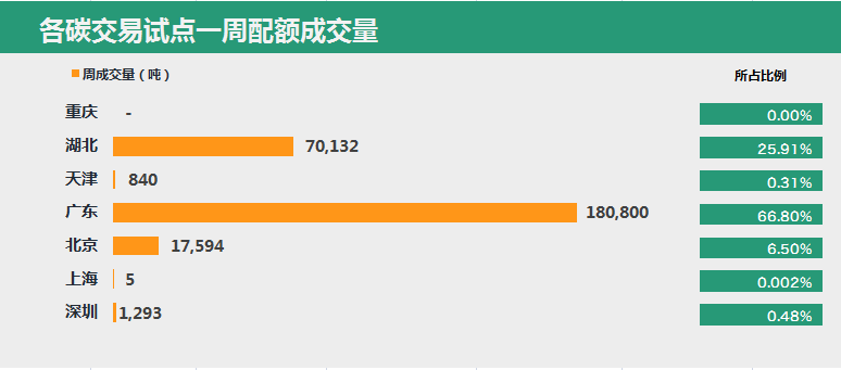 本周,7个碳交易试点共成交配额270,664吨,环比增加105.37%,配额总成交量比上周增加了103.89%,达529.53万元。详情参考如下:
