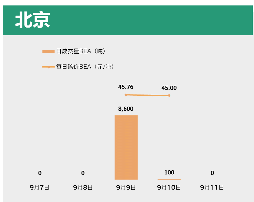 北京碳市本周仅有两天交易产生。两天BEA共成交8,700吨,成交额398,000.00元,碳价在45.00元/吨~45.76元/吨的区间内。