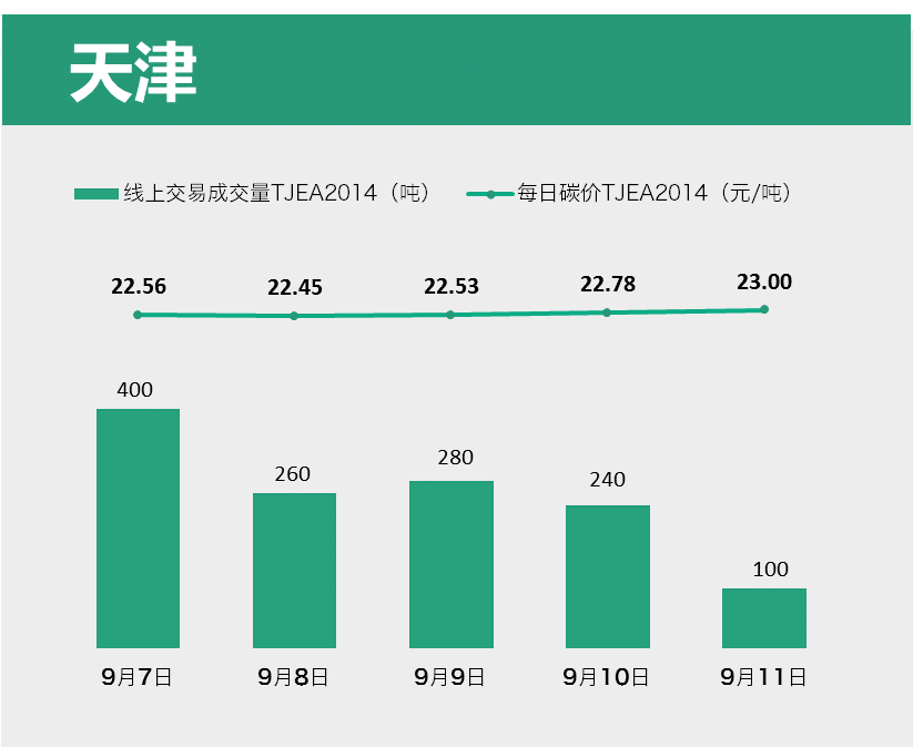 本周天津碳市共成交配额1,280吨,成交额28,938.00元。碳价在22.45元/吨~23.00元/吨的区间内小幅波动,价格水平基本与上周持平。