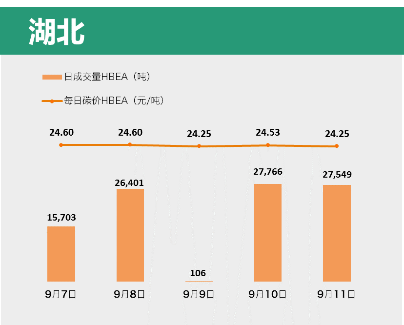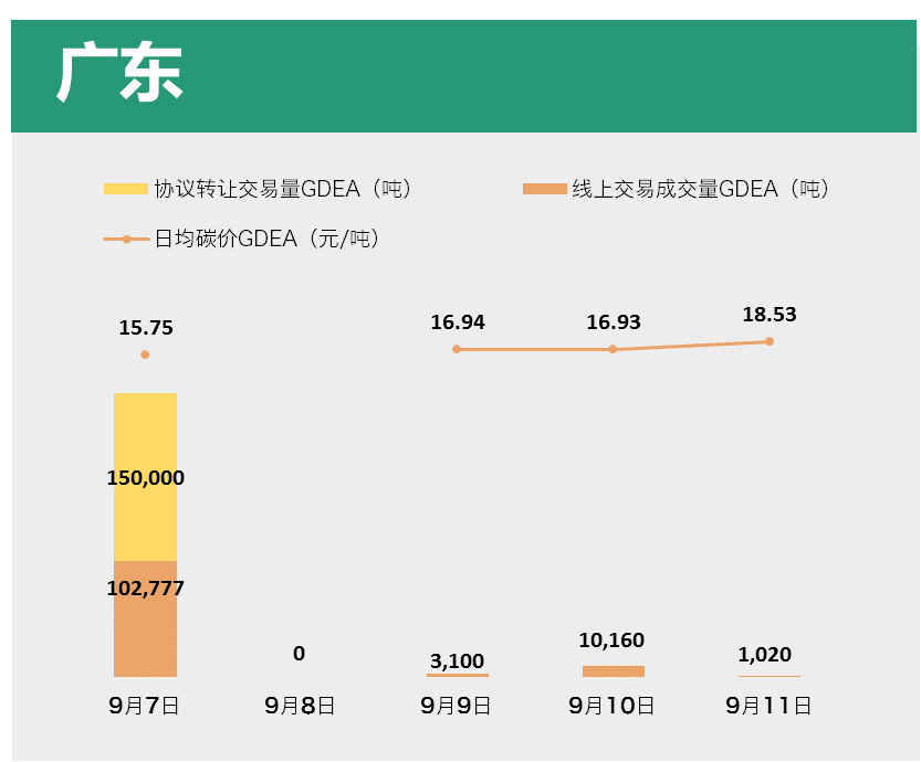 本周广东碳市配额交易量继续大幅增加,GDEA共成交267,057吨(包含协议转让150,000吨),成交额4,224,189.73元。其中交易量集中在9月7日,当天成交量占周总成交量的94.65%。本周碳价在15.75元/吨~18.53元/吨的区间内,呈上涨趋势。