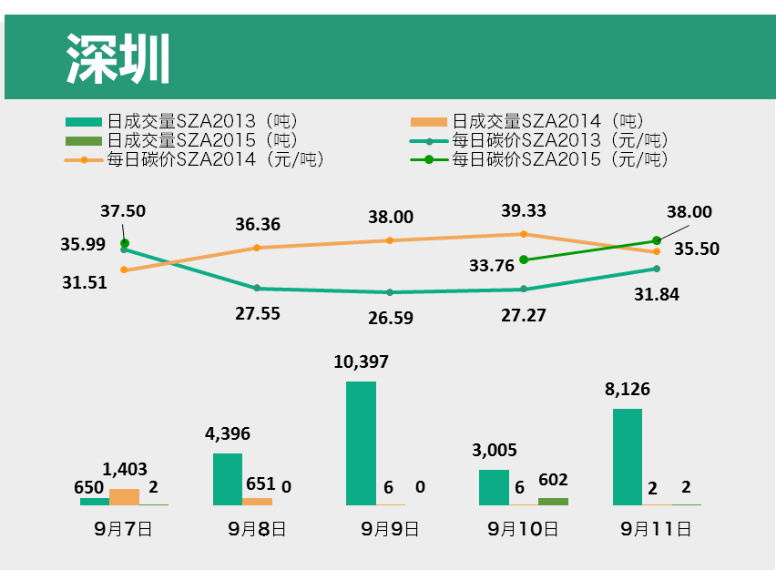 本周深圳配额成交量为29,248吨,成交额850,572.75元。其中SZA2013的交易量最大,本周共成交26,574吨。碳价方面,SZA2013价格在26.59元/吨~35.99元/吨的区间内,SZA2014价格在31.51元/吨~39.33元/吨的区间内,SZA2015价格在33.76元/吨~38.00元/吨的区间内。
