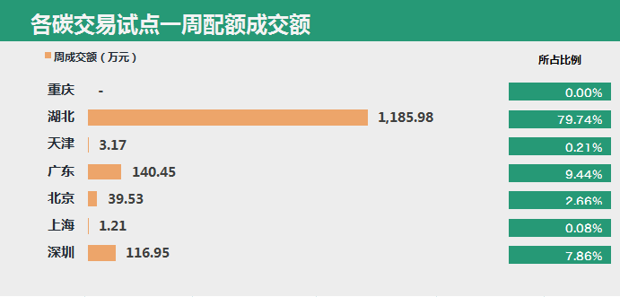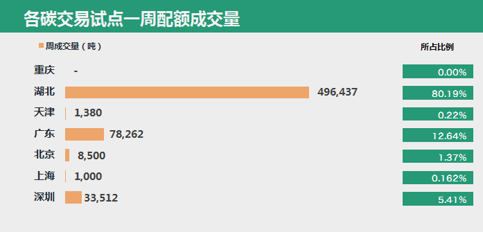 本周,全国碳交易共成交配额619,091吨,环比增加53.31%,总成交额1487.28万元,环比增加88.52%。详情参考如下: