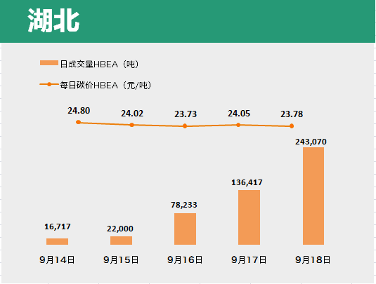 本周湖北碳市情况良好,总共成交496,437吨HBEA,成交额为11,859,846.14元。本周HBEA均价为23.89元/吨,单天均价最高为周一的24.80元/吨,最低为周三的23.73元/吨。成交量呈上升态势。