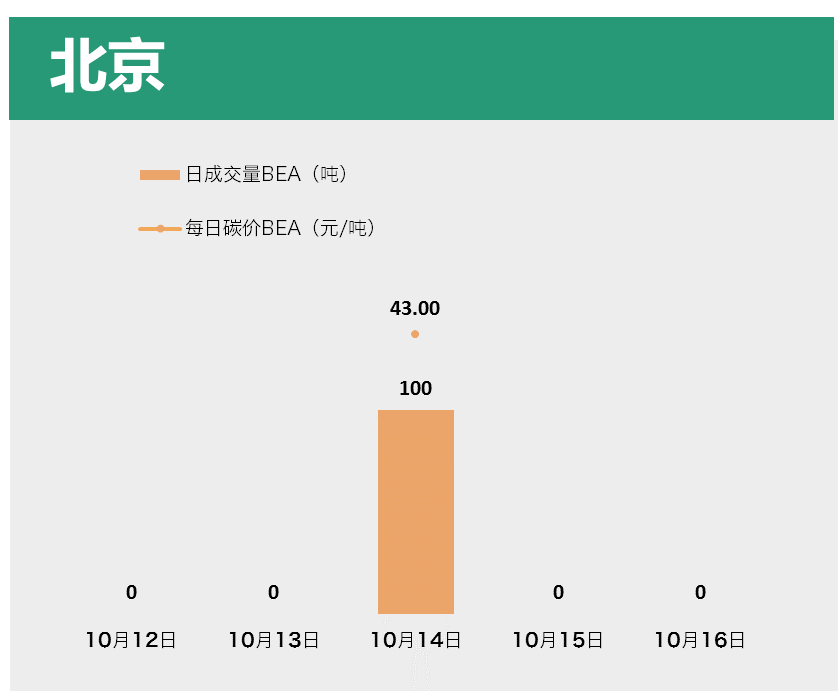 本周北京碳市仅周三有交易产生, BEA成交量为100吨,成交额为4,300元,成交量和成交额均比上周稍有下降。本周BEA成交均价43.00元/吨,环比上涨4.64%。