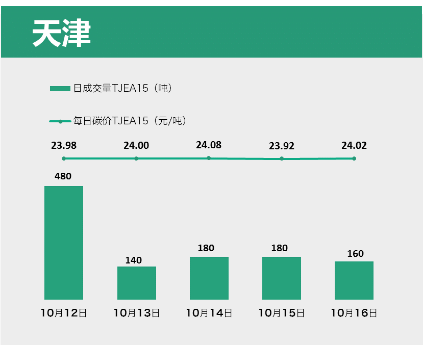 本周天津碳市共成交1,140吨TJEA,总成交额27,351元。周成交均价为23.99元/吨,较上周有小幅上涨。