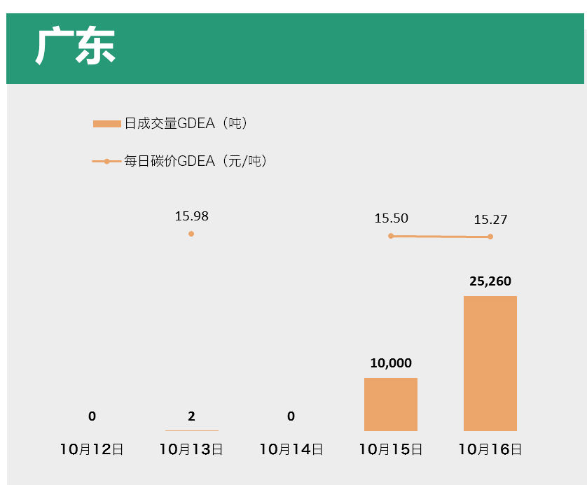 本周广东碳市共有3天交易产生,共交易35,262吨GDEA,其中以周五的GDEA成交为主,交易量为25,260吨。本周总交易额为540,686.46元。本周配额成交均价为15.33元/吨,交易价格在15.27~16.50元/吨范围内浮动。