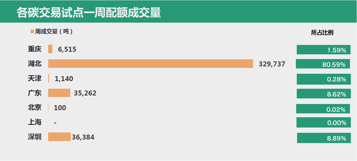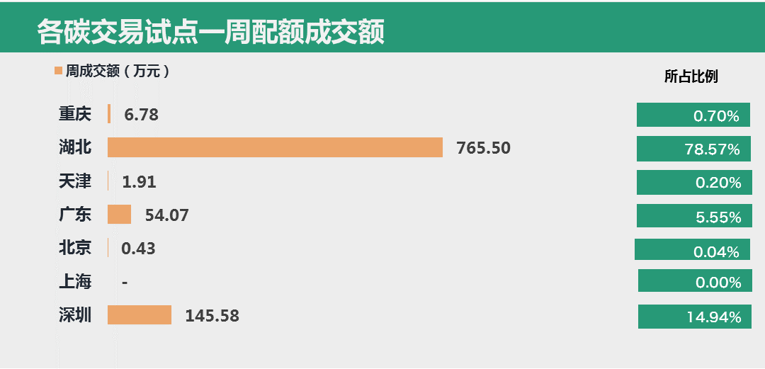 本周,全国碳交易共成交配额409,138吨,总成交额974.26万元。详情参考如下: