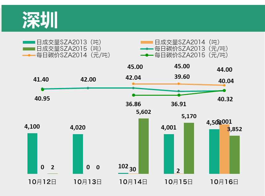 本周深圳配额总共成交36,384吨,成交额为1,455,779.04元。其中,品种SZA2013成交16,725吨,SZA2014共成交5,033吨,SZA2015共成交14,626吨。本周深圳碳市配额平均价格在40.01元/吨,比上周40.96元/吨的均价明显下跌,而品种成交总量上涨,占全国成交总量8.89%,超过广东碳市,排名全国第二。