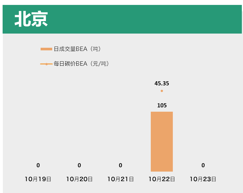 北京碳市仅有一天交易产生,共交易配额105吨,成交额4,320.00元,碳价为45.39元/吨。