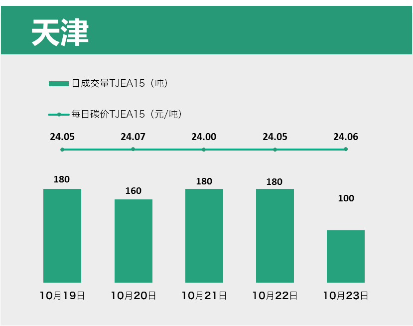 天津碳市维持量少价稳的状态。本周共成交800吨TJEA15,环比减少29.82%,成交额19,235.00元,环比减少29.67%。碳价约为24.00元/吨,波动较小。