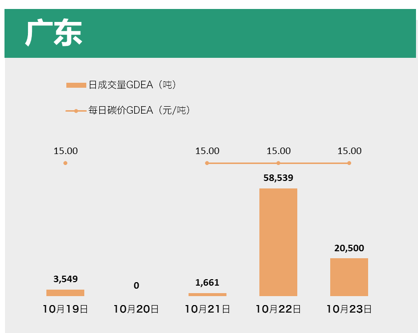 本周广东碳市交易量大幅上涨,共交易GDEA 84,249吨,成交额1,263,730.00元,环比增长率分别为138.92%和133.73%。其中10月22日成交量达58,539吨。本周配额价格稳定在15.00元/吨的水平。