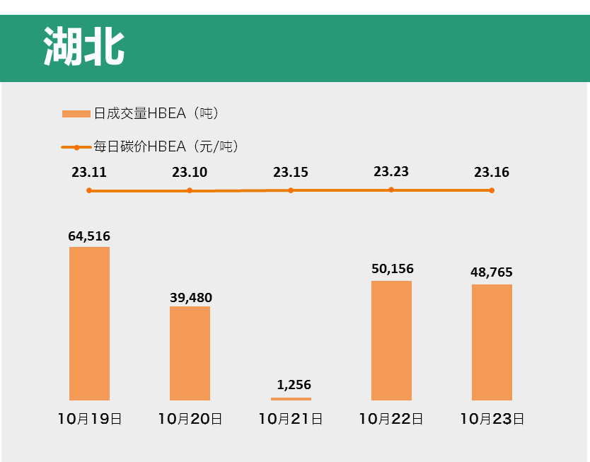 虽较上周交易量有所下降,但湖北碳市依旧蝉联成交量最大的试点之地位。本周共成交HBEA 204,173吨,环比减少38.08%,成交额为4,726,509.4元,环比下跌38.26%。除了周三外,其余四天交易量均在39,400吨以上。碳价在23.10元~23.23元的区间内小幅波动。