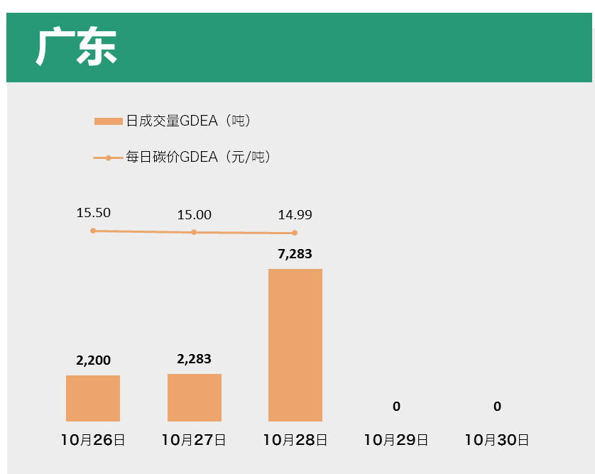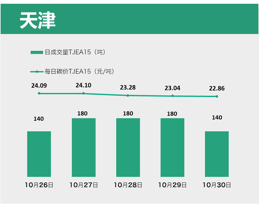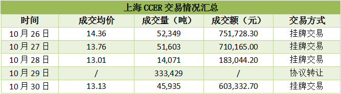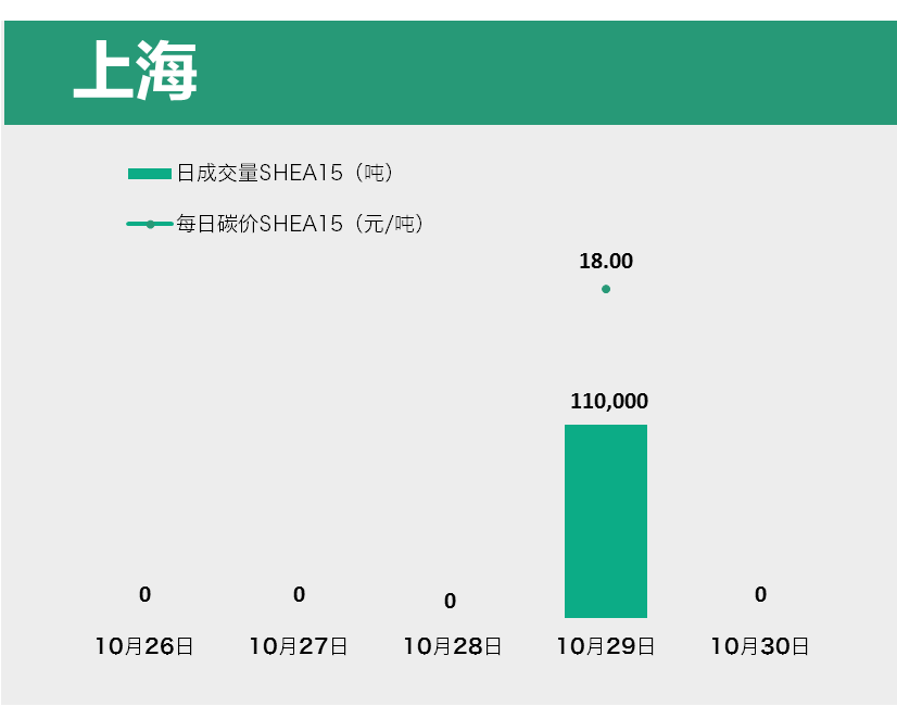 10月29日,上海碳市协议转让配额210,000吨,交易额3,780,000.00元。价格18.00元/吨,较上周配额在线交易价格有明显上升。