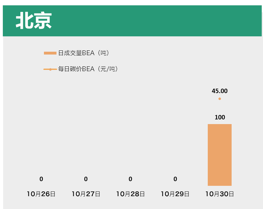 北京碳市仅有一天交易产生,共交易配额100吨,成交额4,500.00元,碳价为45.00元/吨。