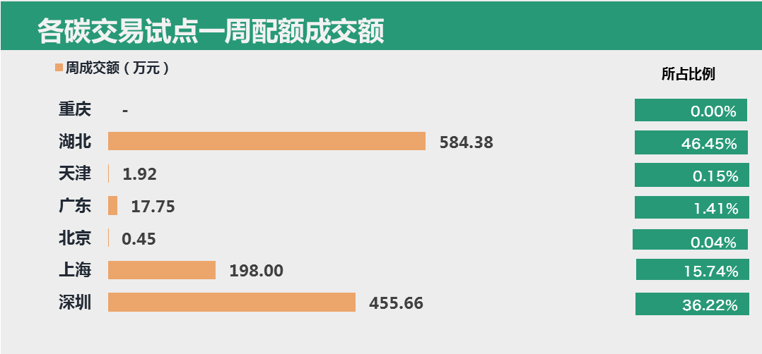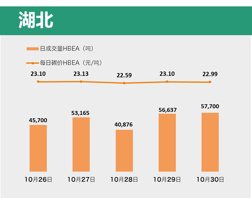 湖北碳市共成交配254,078吨,成交额5,843,782.10元,环比增长率分别为24.44%和23.64%。保持全国配额成交量最多试点的位置,每天成交量均保持在40,000吨以上。碳价在22.59元/吨~23.13元/吨的区间内波动。