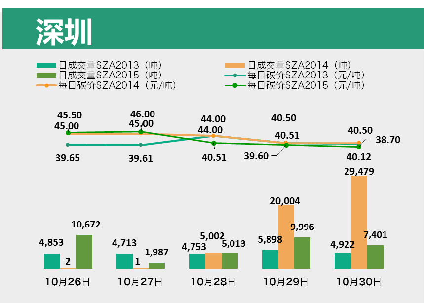 本周深圳碳市成交活跃,成交量继续上涨,共成交配额114,696吨(其中10月26日SZA2015有大宗交易10670吨),成交额4,556,573.70元,环比增长率分别为83.19%和81.82%。10月29日及10月30日两天,SZA2014交易量达20,000吨以上。深圳配额交易价在39.65元/吨~46.00元/吨的区间内波动,为七大试点中最高配额价格。