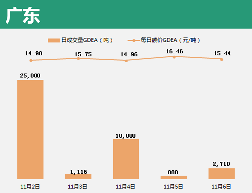 本周广东碳市交易量大幅上涨,共交易GDEA 39,626吨,成交额596,639.48元,环比增长率分别为236.78%和236.11%。本周平均碳价15.06元/吨,与上周相比波动不大。