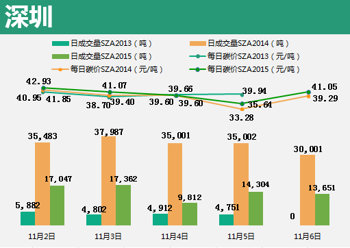 本周深圳碳市表现活跃。共成交配额265,997吨,环比增长131.91%,成交额10,426,127.54元,环比增长128.82%,成交量及成交额在全国碳市的比例均为七大碳市之首。其中SZA2014成交最为活跃。碳价方面,SZA2015周平均碳价为40.23元/吨,比SZA2013和SZA2014周平均碳价稍高。另外,本周四品种SZA2014的交易配额中有30,000吨为大宗交易。