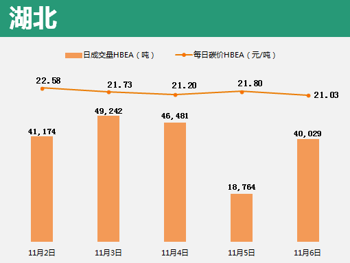 本周湖北碳市共成交HBEA 195,690吨,环比减少22.98%,成交额为4,235,963.00元,环比减少27.51%。除了周四外,其余四天交易量均在40,000吨以上。本周平均碳价为21.65元/吨,价格在21.00元~24.18元/吨的区间内波动,平均碳价较上周有所下跌。