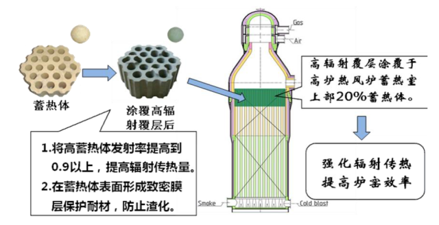 高辐射覆层材料具有高辐射、高吸收的特性,将其涂覆在复杂结构的高炉热风炉与焦炉的蓄热体表面及燃烧室内壁,可以提高蓄热体和燃烧室立火道表面的发射率(从涂覆前的0.7~0.8 提高到0.90 以上),强化高温环境下固体表面与气体间的辐射传热,提高蓄热体的表面温度,加大表里温度梯度,增加了蓄热量,提升能源利用效率,降低燃料消耗。