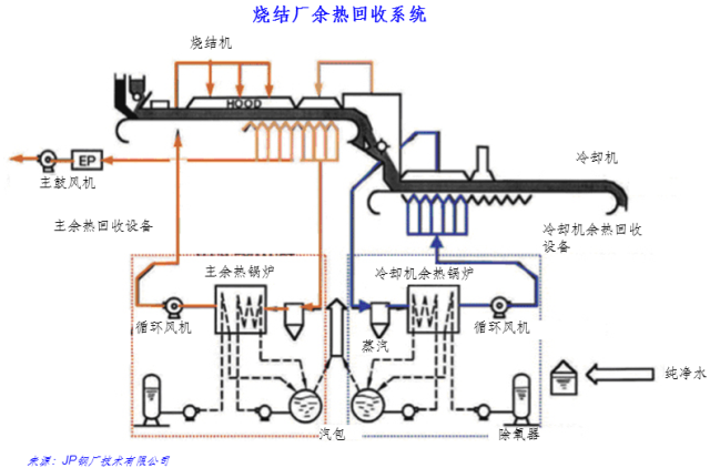 从烧结机排气中和烧结冷却机废气中回收显热。