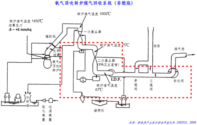 非燃烧法:阻止一氧化碳变成二氧化碳(即燃烧),在余热锅炉中首先回收富含一氧化碳的煤气显热,产生高压蒸汽,之后对转炉煤气进行清洗、储存,最后与其他副产煤气混合用作燃料。