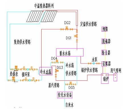 (2)合理的能量传输阵列技术。作为大规模安装的太阳能工业热力系统,通过集热器阵列布置和管路系统的分配技术,达到将热能全部传输至锅炉水箱使用,避免热量在集热器内的损失;